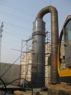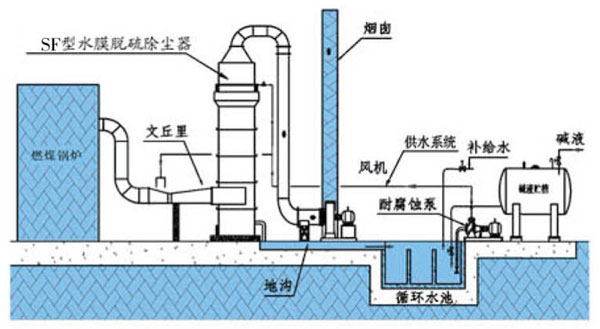 六、安裝 1、在適當位置進行地面處理做好基礎(chǔ)?;A(chǔ)尺寸以圖紙為準?;A(chǔ)平整面上放上普通1:1的濃砂漿料,高2cm,必須在邊上10cm的圓周內(nèi),中間不能放砂漿料。如果放了將影響除塵器的受力,造成壓裂、漏水現(xiàn)象。第一節(jié)四周平整后,用鋼板壓上5-6個點,鋼板必須結(jié)實,以免造成以后設(shè)備的動搖,影響設(shè)備垂直度。 2、安裝第二節(jié)時,先在第一節(jié)上部鋪上耐酸膠泥2cm左右,膠泥不能斷裂,用進口對準鍋爐出口方向。除塵器進口處有文丘里霧化裝置,安裝時需考慮文丘里長度等尺寸。第二節(jié)壓在第一節(jié)上部,安裝時需輕輕壓下,保證內(nèi)壁垂直,外面的接縫必須勻稱。第三節(jié),第四節(jié)等安裝類似。 3、設(shè)備安裝完畢后,把環(huán)形水管安放在水槽上方的掛鉤上。插上軟管,軟管插入水槽口3cm。然后用耐酸膠泥封死,保證不漏風,再用普通水泥把水槽上面的接縫和抹平的下水口重新抹上一遍,厚度2cm,確保不漏風漏水。環(huán)形水管由2半圓環(huán)形管組成,安裝時需用膠水粘合成整圓。環(huán)形水管有2路進水管口,2路水管需在除塵器底部匯合成1路與水泵出口的循環(huán)水管相接。循環(huán)水管需用316L不銹鋼制作,外面做好保溫。循環(huán)水管需分1路316L水管到文丘里噴淋裝置處,分水口可開在任何一根管路上,此管路也需保溫。 4、文丘里接頭處用軟皮密封,螺栓必須擰緊,保證不漏風漏水。鍋爐出口風管必須高于文丘里高度,以防停機時文丘里內(nèi)液體倒流。 5、安裝全部結(jié)束后,外面的縫隙必須用普通水泥抹平。不可用耐酸膠泥,因為耐酸膠泥含氟硅酸鈉成分,遇雨水后有白色的水流痕跡,影響外觀。 6、如果設(shè)備是正壓安裝,則接縫處需把砂漿清洗干凈,然后將節(jié)與節(jié)之間的縫隙用電焊焊死,必須是滿焊。然后再用普通水泥抹平。以免正壓造成設(shè)備漏風漏水,影響效果。 7、正壓安裝,如果是直排煙囪,則直排煙囪需用鋼絲繩拉緊,保證直排煙囪的穩(wěn)固。 五、運行維護 1、運行前應(yīng)檢查脫硫除塵器質(zhì)量是否符合要求,保證供水系統(tǒng)暢通,排灰口封嚴密不漏; 2、運行前,應(yīng)先開引風機,再向供水系統(tǒng)供水,停爐時,應(yīng)在關(guān)閉引風機前停止向系統(tǒng)供水。運行中,筒體絕對不允許斷水; 3、要求脫硫效率在80%以上的,必須定時定量在循環(huán)池中加入堿液,使循環(huán)水中的PH值保持在12以上,使沉淀池中的酸性廢水和加入的堿水中和沉淀過濾后可循環(huán)使用; 4、如除塵器長時間停止運行或運行時上部水槽出現(xiàn)泛水現(xiàn)象,則應(yīng)向水槽提供清潔水源沖刷一小時左右。 ![]() 安裝說明: 1、 最下面一節(jié)筒體的底部必須要鋪墊水泥砂漿,并在安裝時要找水平,此項工作結(jié)束后,再進行下步工作。 2、 第二節(jié)進口位置必須與鍋爐風管出口一致。 3、 水槽、頂出口、環(huán)形水管均已在出廠前安裝好,現(xiàn)場只需進行節(jié)與節(jié)之間的連接。 4、 最上端一節(jié)安裝前所有下部筒體內(nèi)外必須均抹平實膠泥。 5、 在檢修時必須關(guān)閉水泵和引風機。 說明:本水膜除塵器為左進風,也可為右進風。 |